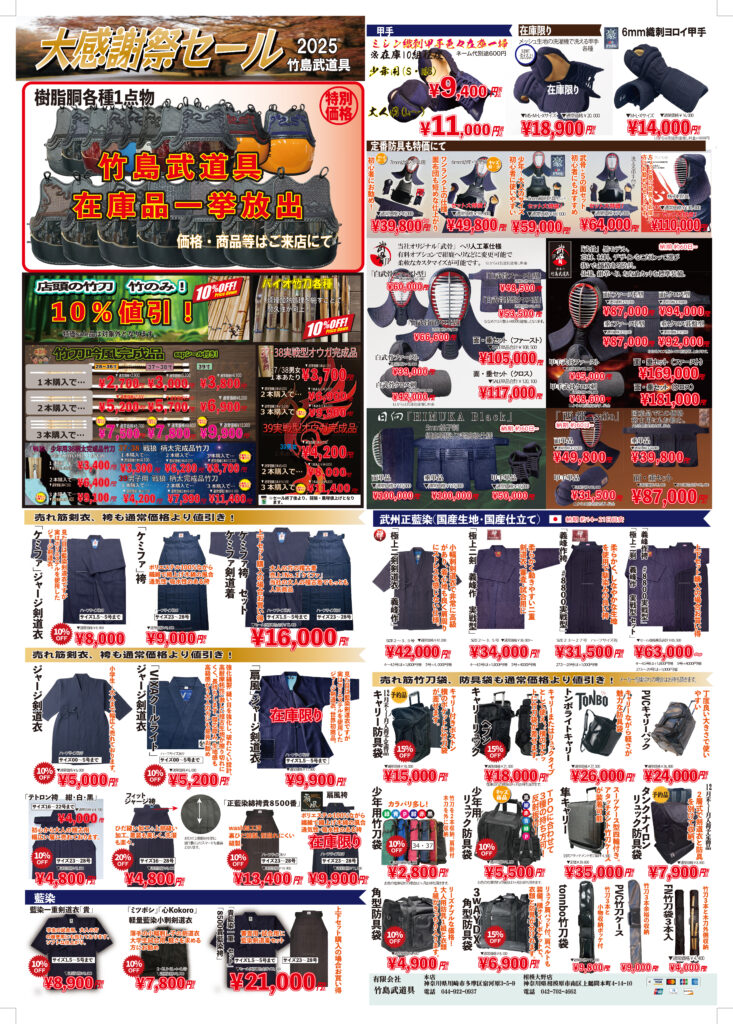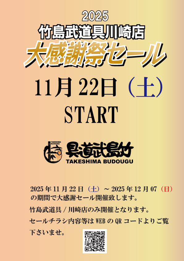 2025 竹島武道具 セール 投稿日 2025年11月15日 更新日 2025年11月16日 著者 竹島武道具 カテゴリー お知らせ 2025年11月末~12月中旬を予定しております。 宜しくお願い致します。 竹島武道具SALE、竹島武道具せーる